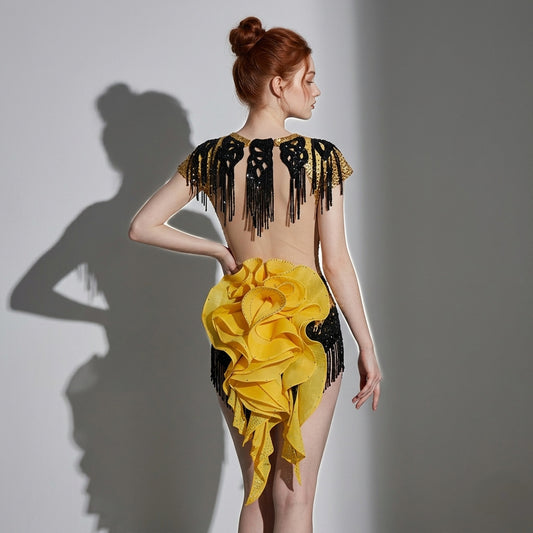 Regular price $194.00 USDRegular priceUnit price / perSale price $194.00 USDByCharme Dark Yellow Gold Black Fringes Latin Salsa Dress - BCL-0208