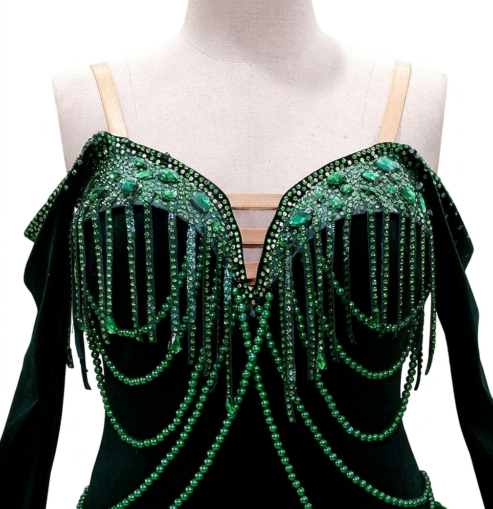ByCharme Dark Green Velvet Fringes Pearls Latin Salsa Competition Dress - BCL-0191