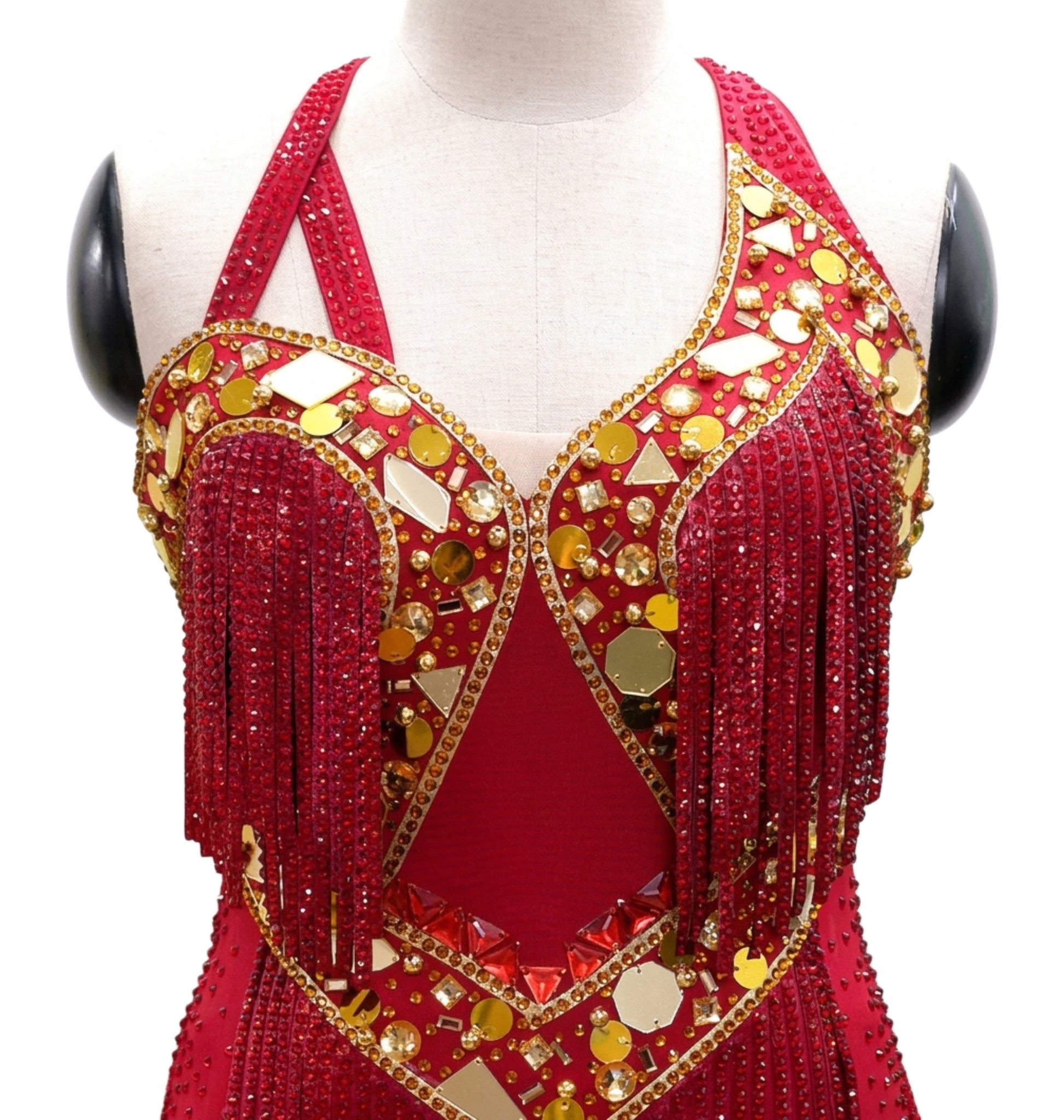 ByCharme Red Gold Fringes Latin Salsa Competition Dress - BCL-0156